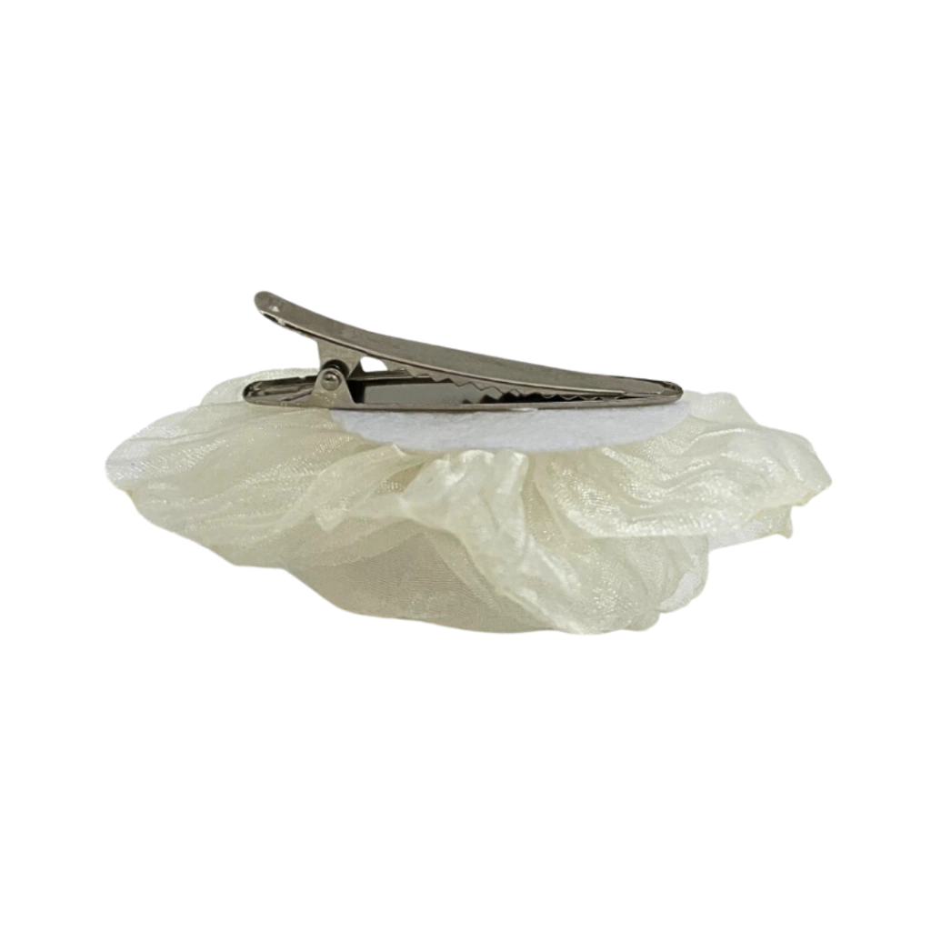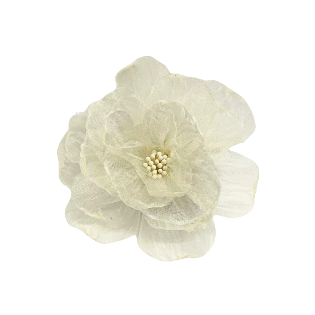 Prendedor Flor Peônia, desenvolvemos uma opção para quem procura por um acessório de mesmo efeito, porém mais minimalista e com fecho bico de pato. A flor é feita em organza texturizada, por isso, a peça é leve de usar e fica incrível para criar “arranjos” no penteado.