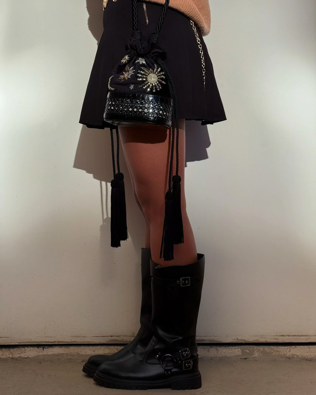 DETALHES: Patches bordados com temas celestiais, forro em veludo preto, alça longa