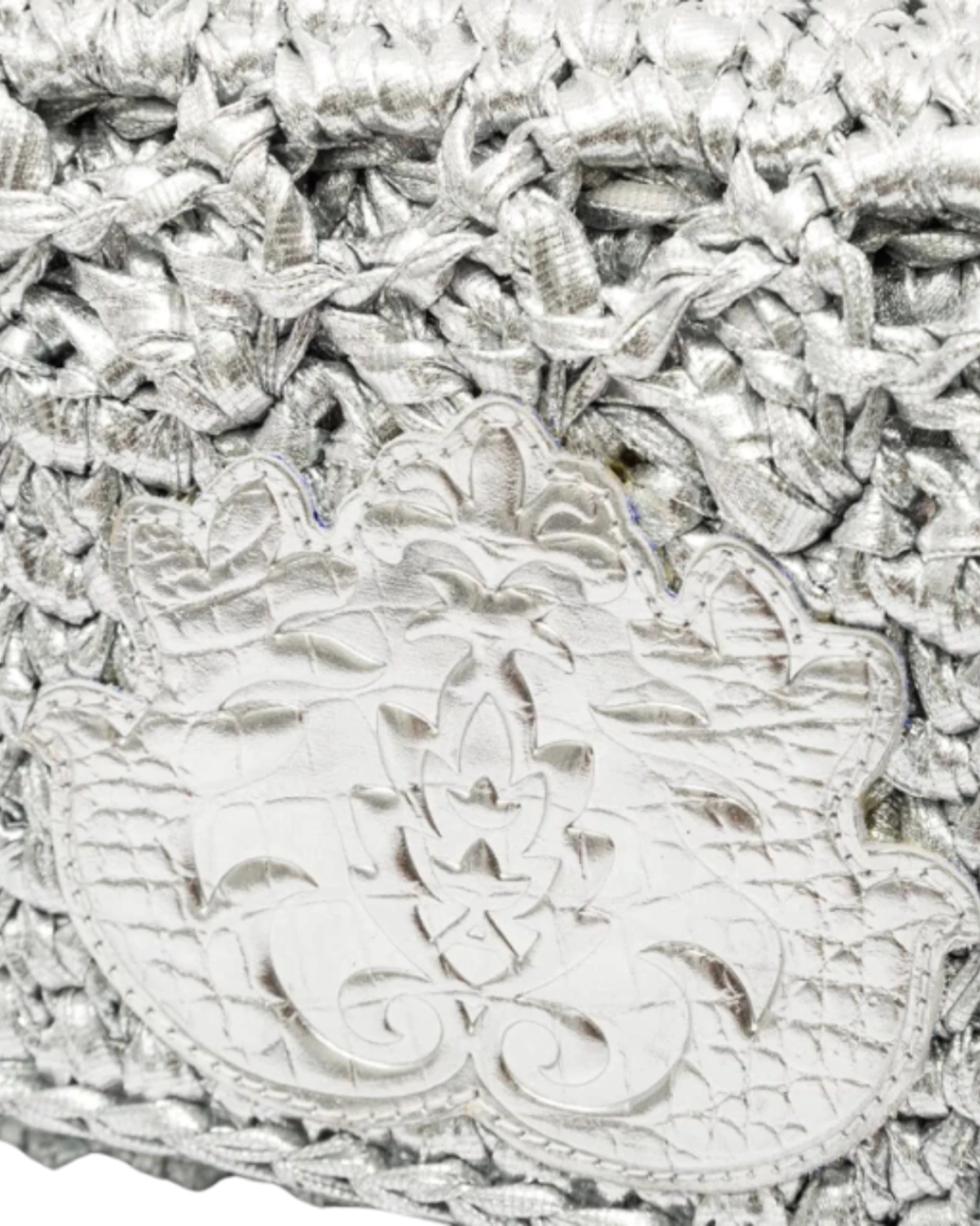 Esta bolsa de crochê combina um brilho futurista metalizado com a praticidade de uma alça ajustável em couro. Pode ser usada a tiracolo ou no ombro, oferecendo segurança com seu fecho de encaixe. Detalhe da logo marca em couro.\</p\> \