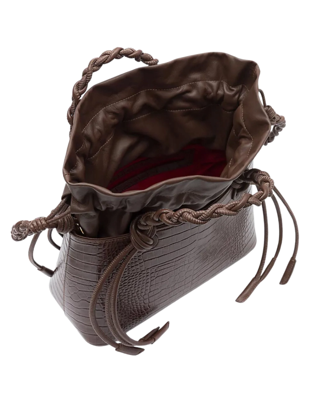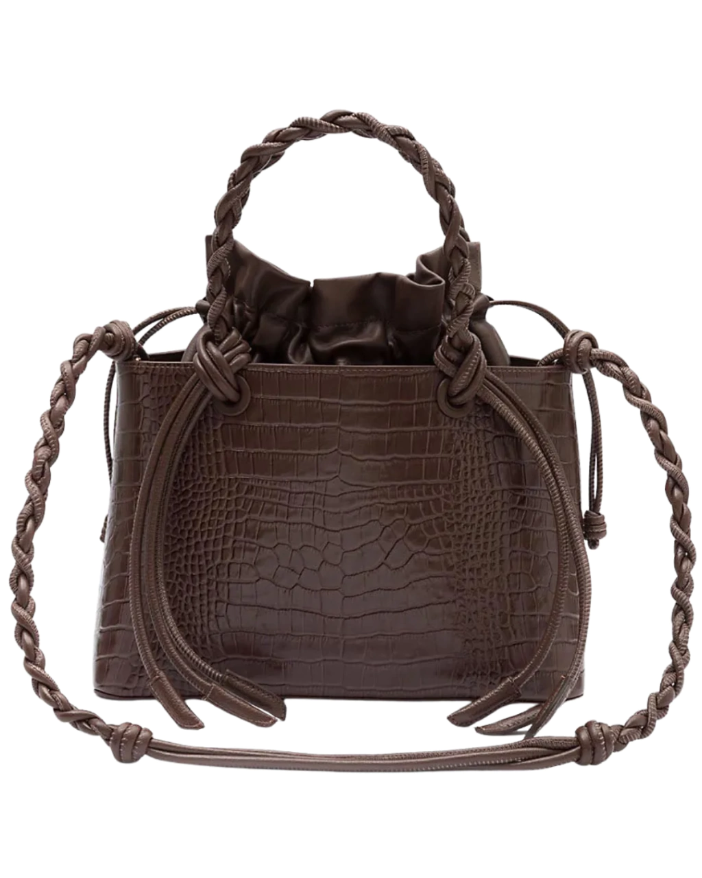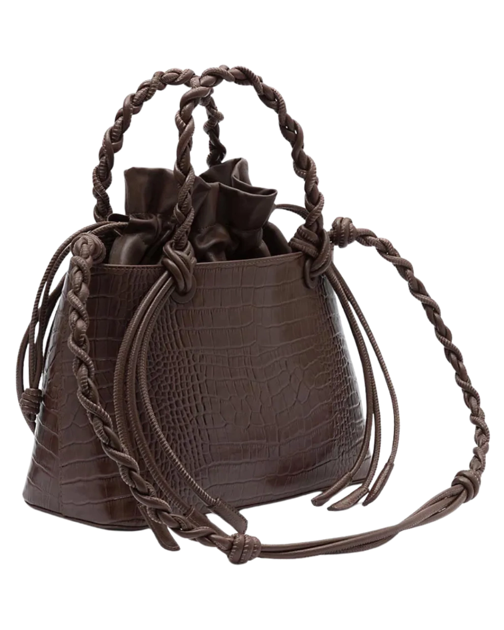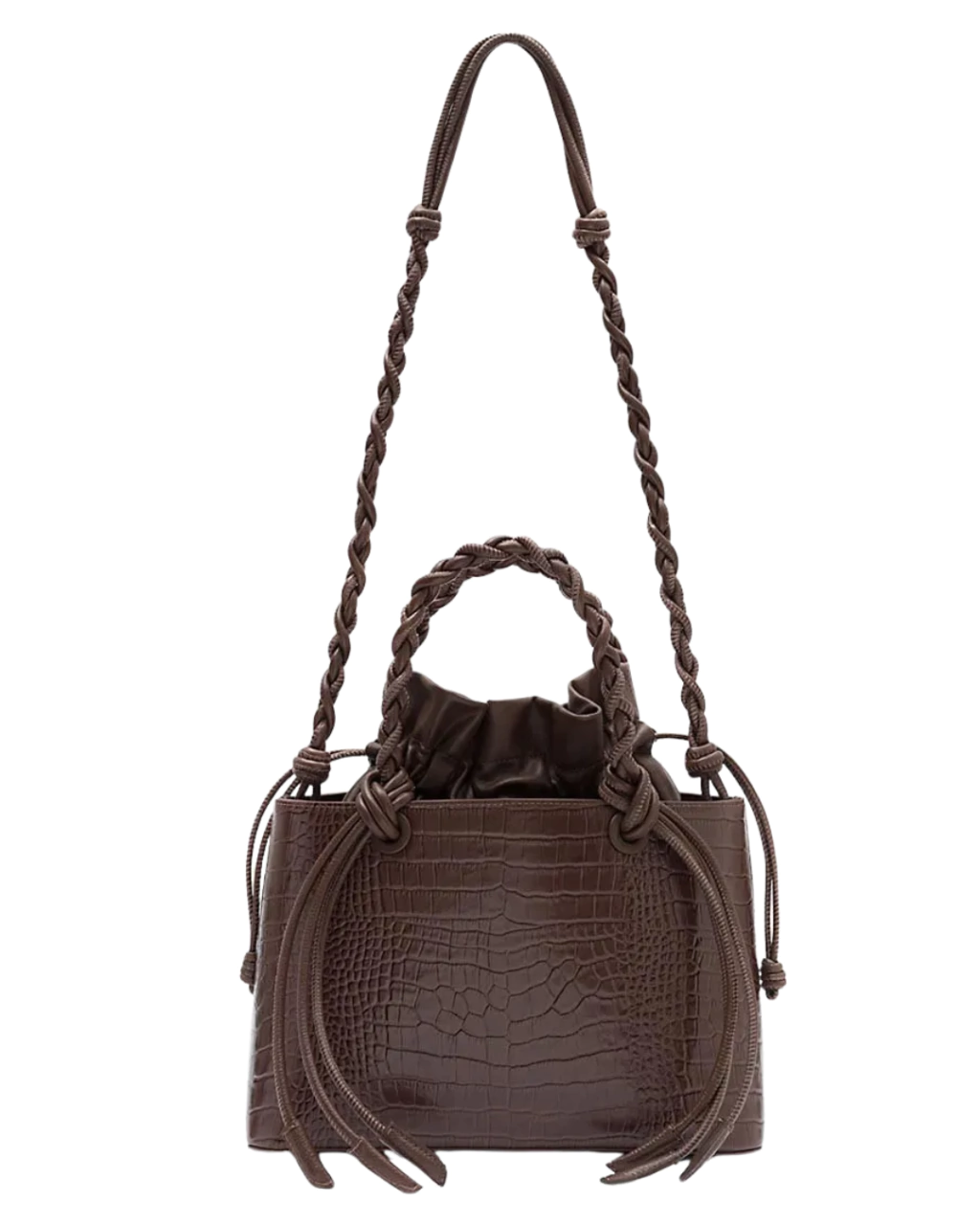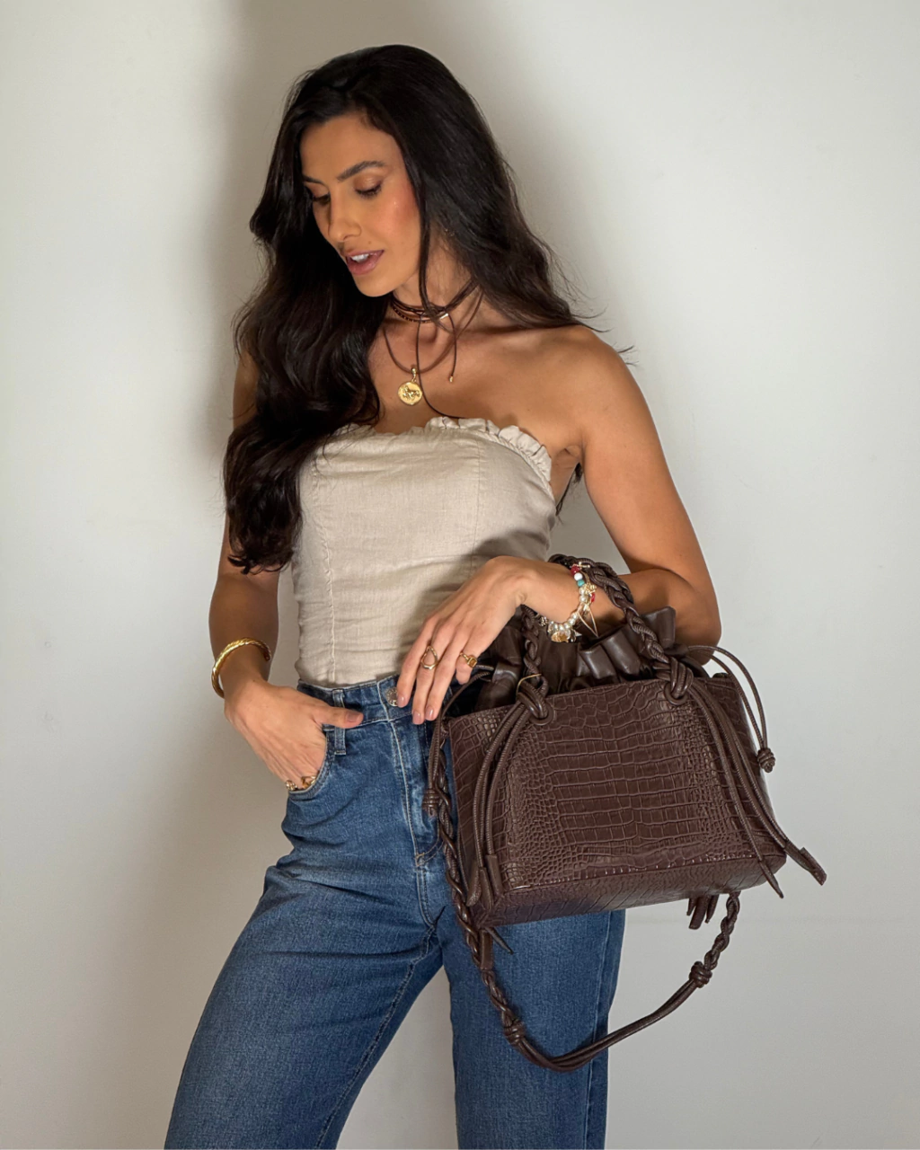 Sua estrutura média no estilo bucket proporciona amplo espaço interno, e o fechamento em enforcador garante praticidade. A alça de mão em rolotê de couro trançado com franjas longas confere um toque artesanal e dinâmico, e acompanha alça longa ajustável para diferentes formas de uso.