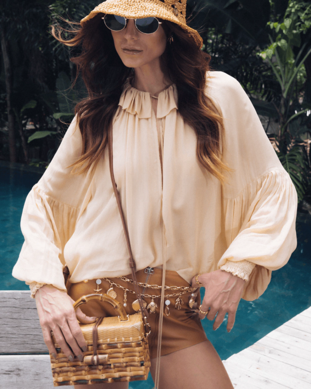 O fechamento com corda trançada de couro e detalhe em bambu com ímã adiciona um toque artesanal à estética refinada da peça. Ideal para o dia a dia, passeios de resort ou composições de praia urbana, ela combina leveza e estrutura em uma leitura contemporânea do estilo natural chic.