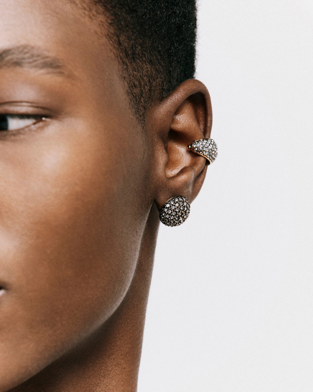 A família Infinity apresenta formatos circulares que remetem ao mundo espiritual, ao misticismo e à fé como fontes de poder e força interior. De forma lúdica, diferentes tamanhos e agrupamentos de círculos e esferas, inteiramente cravejados de cristais, compõem as criações que brincam de orbitar sobre a pele. O Brinco Maxi Botão Infinity foi produzido artesanalmente, no banho ouro vintage, com 108 cristais black diamond aplicados manualmente, um a um.