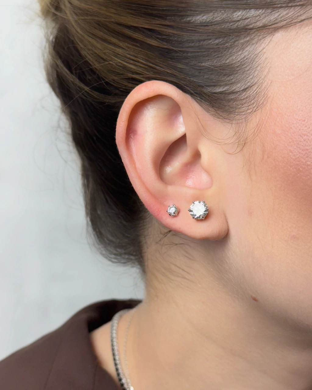Versátil e elegante, o brinco solitário em moissanite combina com qualquer look — do casual ao sofisticado. Pode ser usado sozinho para um visual clássico ou em combinações com outros piercings e brincos menores para uma proposta mais moderna.