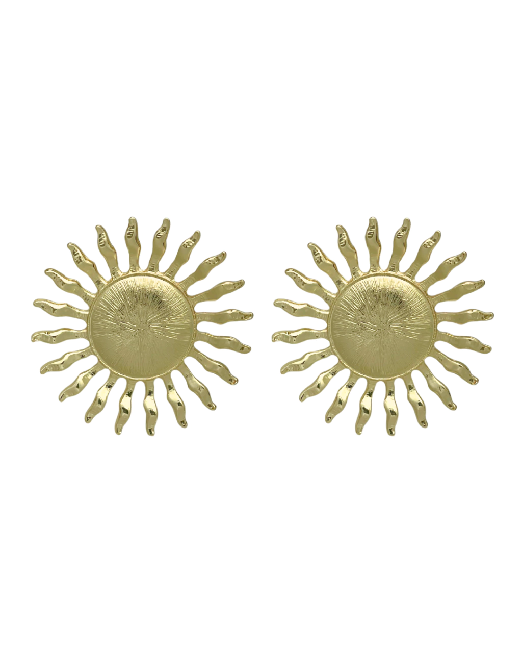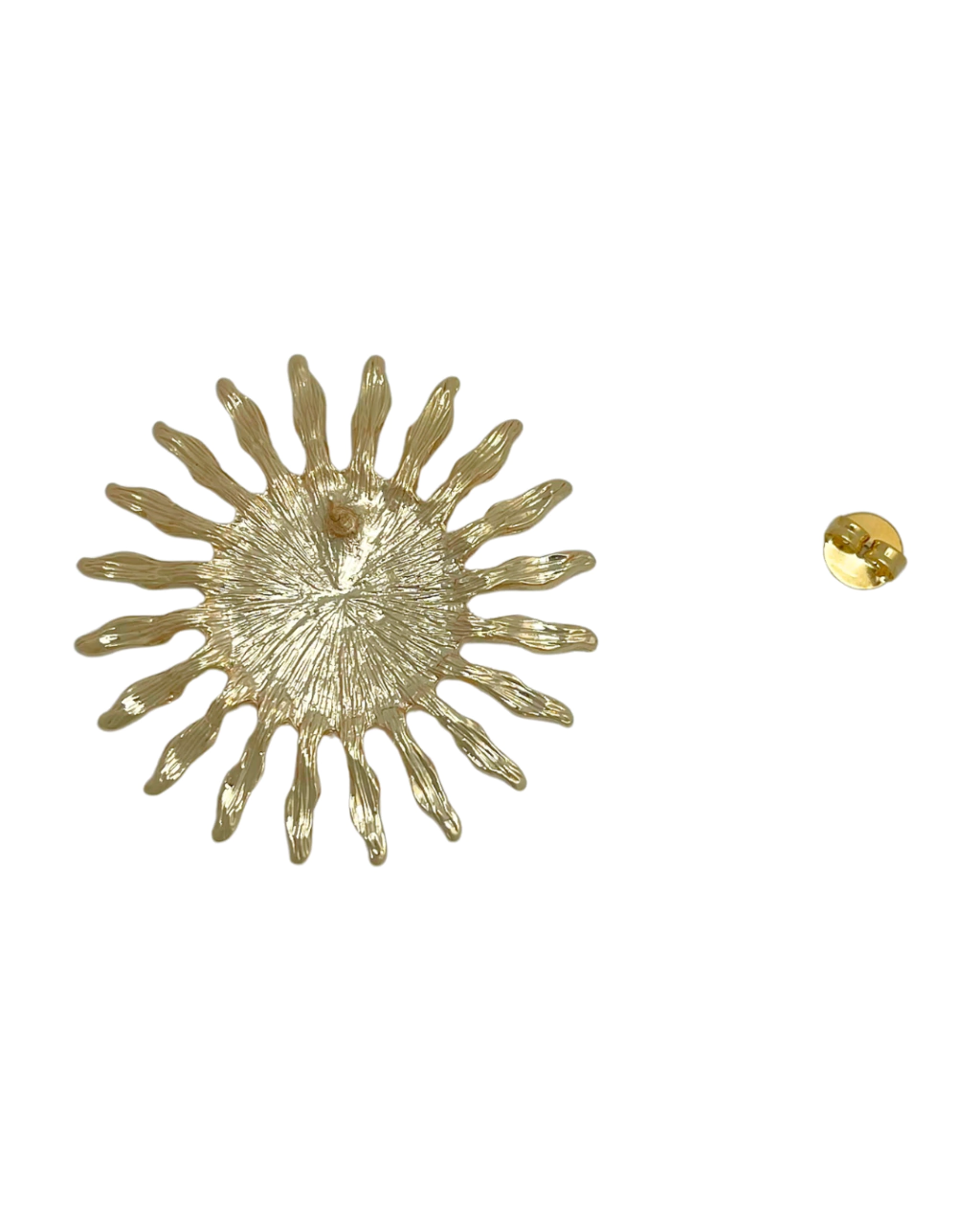 O Brinco Sunshine é uma peça statement que irradia energia e estilo. Com um design marcante no formato do sol, ele possui um corpo central texturizado e raios vazados que criam um efeito visual imponente e sofisticado. Ideal para quem busca um acessório dourado que seja o protagonista do look, adicionando um toque de verão e originalidade.