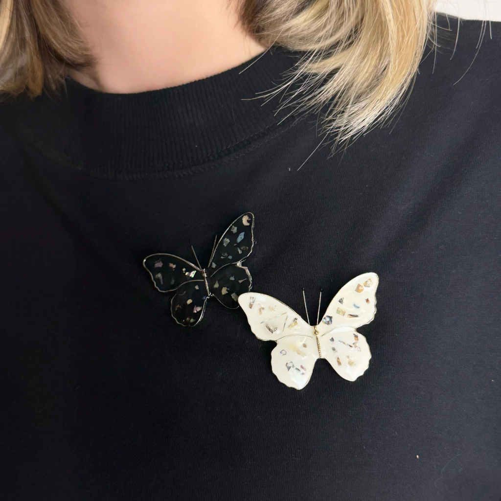 Borboletas são a nossa paixão. O modelo Butterfly é quase uma obra de arte: as asas são esmaltadas manualmente e, logo em seguida, flocos de madrepérola abalone são salpicados nesse esmalte ainda úmido. O corpo é todo feito em metal e as anteninhas são delicadas e maleáveis.
