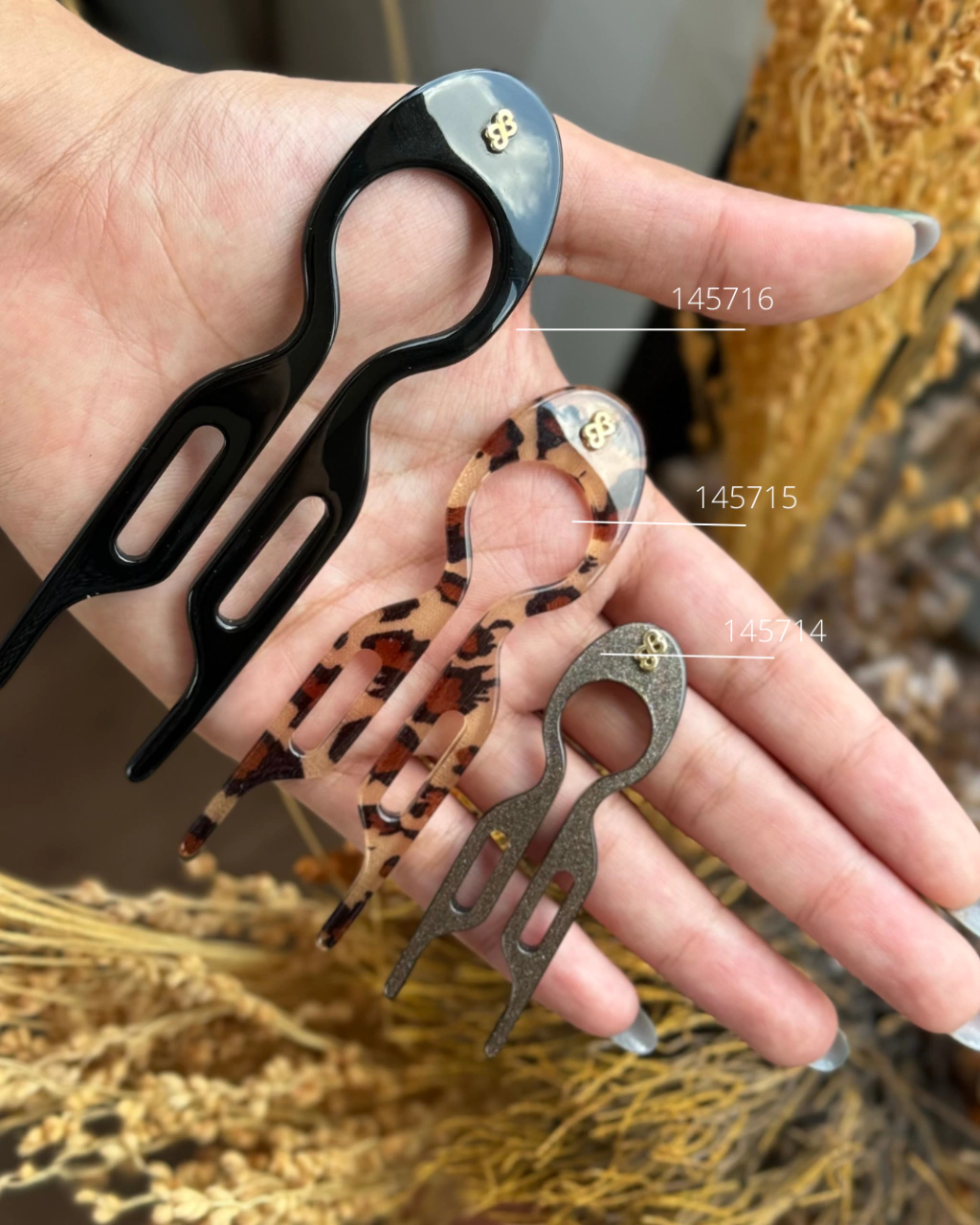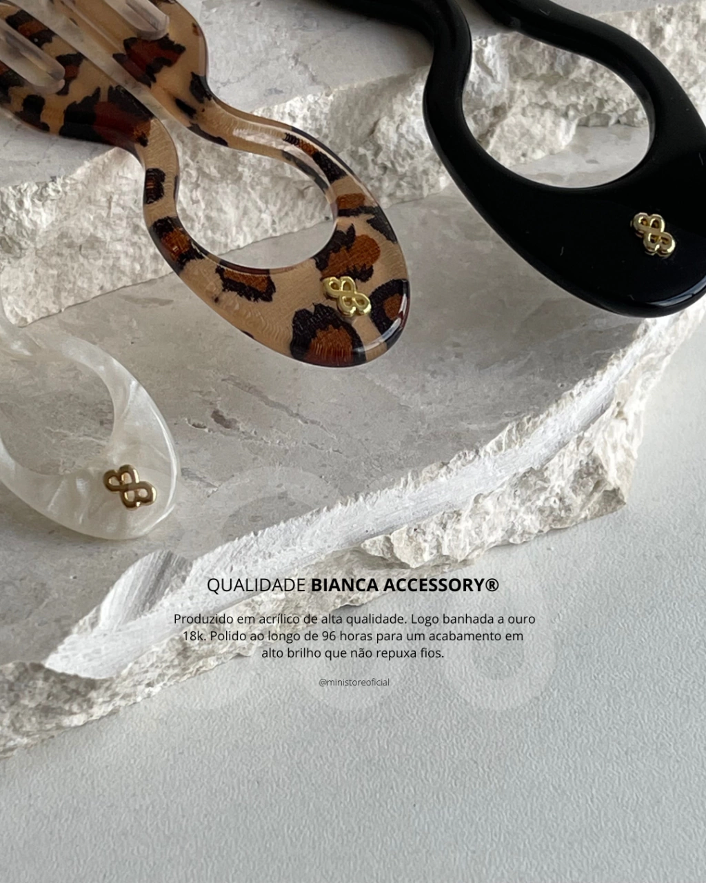 O "Hair Pin Bianca Vintage" é único no mercado, projetado com três tamanhos para diferentes tipos e volumes de cabelo, oferecendo mais aderência e resistência que grampos comuns, prevenindo escorregões. É um produto artesanal 100% nacional da Bianca Accessory®, marca tradicional com fábrica no Brasil desde 1990. Produzido em acrílico de alta qualidade (premium, resistente e à prova d'água), possui um logo banhado a ouro 18k e é polido por 96 horas para um acabamento impecável de alto brilho. O design inclui hastes flexíveis, formato curvo para conforto e trava robusta, protegendo o penteado o dia todo. O material antiestático não conduz eletricidade, prevenindo fios arrepiados e quebradiços. As bordas arredondadas garantem um uso confortável, indolor e sem danos ao cabelo. É um grampo mágico para seu cabelo!