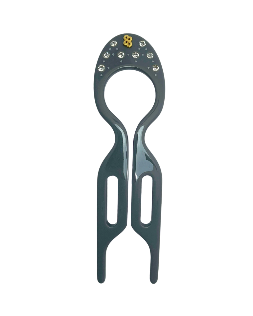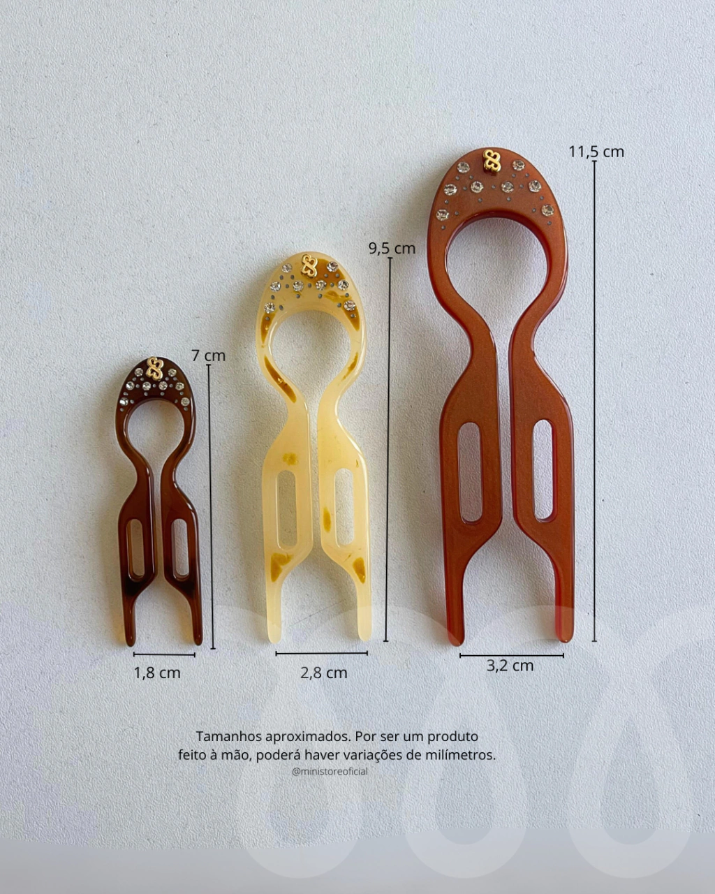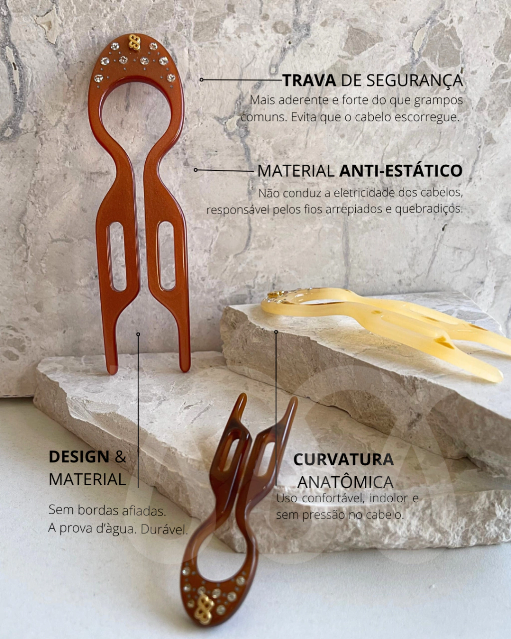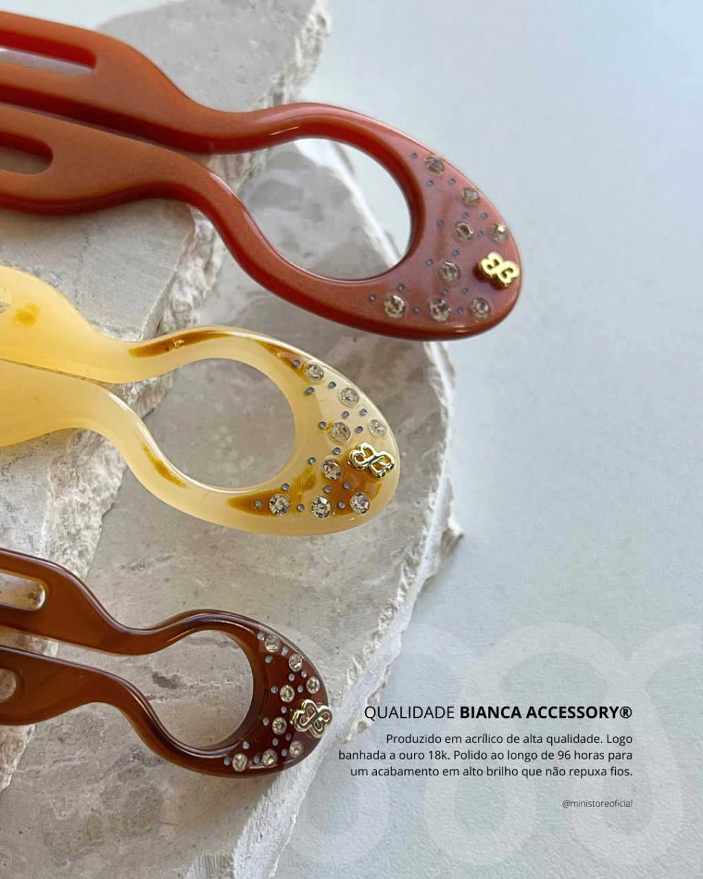 O "Hair Pin Strass Bianca Vintage" é uma peça única no mercado, destacada por 15 pontos em baixo relevo e 8 strass cravejados que garantem aderência sem repuxar os fios. Projetado com três tamanhos para diferentes volumes e curvaturas de cabelo, ele é mais forte e seguro que grampos comuns, prevenindo escorregões. É um produto artesanal 100% nacional da Bianca Accessory®, marca tradicional com fábrica no Brasil desde 1990. Produzido em acrílico premium (de alta qualidade, resistente e à prova d'água), possui um logo banhado a ouro 18k e é polido por 96 horas para um acabamento impecável de alto brilho. O design inclui hastes flexíveis, formato curvo para conforto e uma trava robusta, protegendo o penteado o dia todo. O material antiestático não conduz eletricidade, prevenindo fios arrepiados e quebradiços. As bordas arredondadas garantem um uso confortável, indolor e sem danos ao cabelo. É um grampo mágico para seu cabelo!