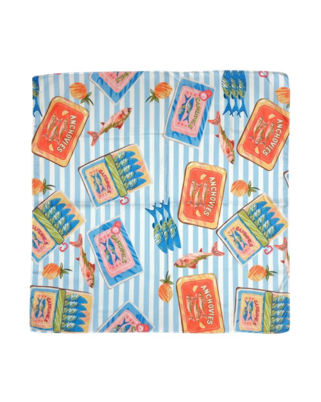 A peça é confeccionada em tecido leve e de alta qualidade de cetim soft, com um caimento suave. A estampa central é um padrão contínuo de Latas de Sardinha e Anchova em diferentes cores (vermelho, azul e laranja) e formatos, misturadas a ilustrações de peixes e pequenos elementos de frutas.