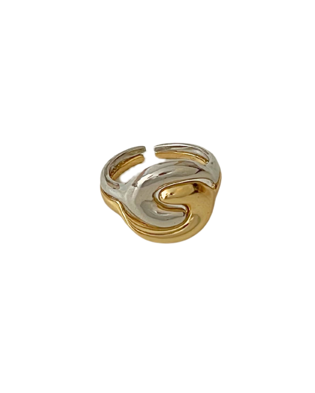 Um anel statement que celebra a união de metais e o design escultural, perfeito para quem busca um acessório moderno e de impacto. A peça é construída em um formato volumoso e orgânico, com um design de curvas e ondulações que se entrelaçam, criando um visual de movimento e fluidez.