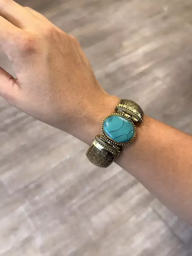 O Bracelete Niyati é uma peça de impacto que une tradição e sofisticação. Seu design trabalhado em dourado com entalhes detalhados ganha ainda mais destaque com a pedra central em tom turquesa, símbolo de proteção e boas energias.