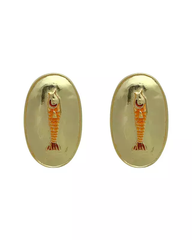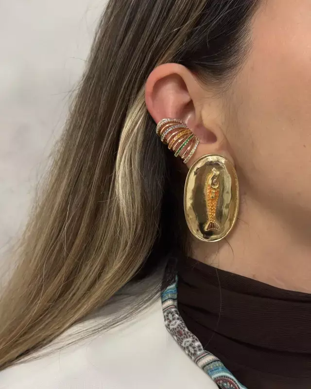 O Brinco Peixinho combina um design clássico com um toque divertido e colorido. Apresenta uma base oval em metal dourado polido, servindo de moldura para um detalhe central: um pequeno peixe esmaltado em tons de laranja e vermelho. Este acessório de inspiração marítima é perfeito para adicionar personalidade e cor a looks casuais ou de verão, mantendo a elegância da peça dourada.