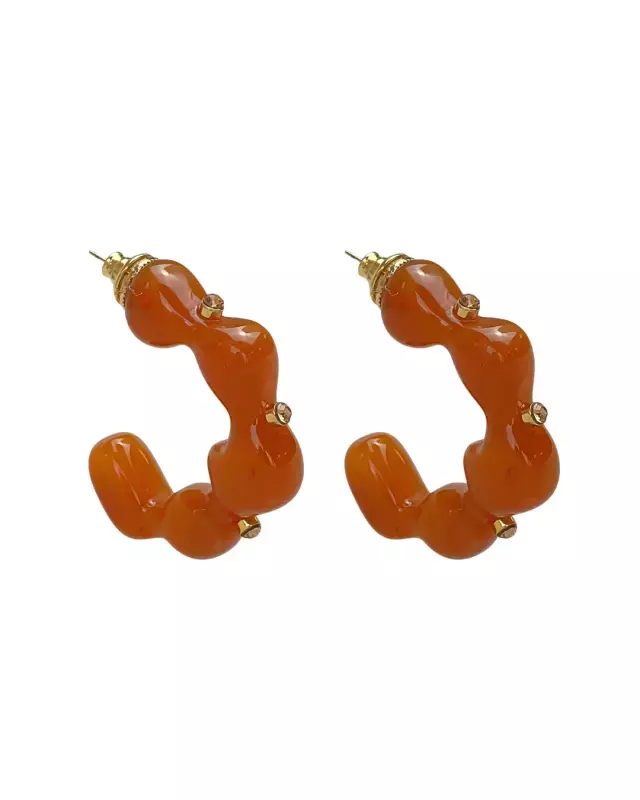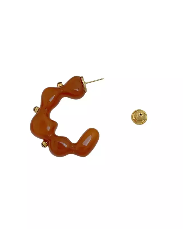 Um brinco de argola com design moderno e artístico, perfeito para quem busca um acessório statement com cor e um toque orgânico. A peça é esculpida em Resina com acabamento liso e brilhante, em uma tonalidade quente de Âmbar. O formato é uma argola em forma de onda, que confere movimento e um visual contemporâneo.